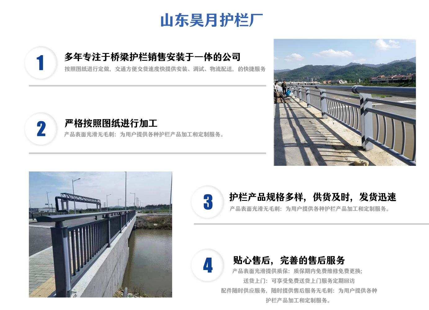 山東昊月金屬制品有限公司坐落于原材料豐富人文和諧交通發達及有“江北水城”之稱——聊城。 公司以科技興廠為宗旨,積極引進人才和技術,不斷開拓創新. 主營產品:SS級橋梁防撞護欄,不銹鋼復合管護欄,鋁合金護欄,燈光護欄,河道護欄等等。產品本公司建立了一套科學的行之有效的質量體系,擁有一支高技術、高素質團隊,堅持以“誠信”為本,堅持“優質的質量、貼心的服務”為崇高理念,為用戶提供質優價廉的產品提供至真至誠的服務。與客戶合作雙贏、攜手共創輝煌?! 」疽钥茖W的工藝、嚴格的質量管理、完善的服務理念、合理的銷售價格贏得了良好的聲譽,建立了密切和愉快的合作關系。多年來,我們一直以良好的品質、合理的價格,完善的質量保障體系,完善的售后服務為客戶提供周到的服務,滿足廣大客戶的需求。 我們以信譽求生存,以質量去競爭,以真誠換合作,以效益求發展,是我們的服務宗旨。我們積極主動與同行加強交流與時俱進,邁向新的歷程!我們竭誠歡迎您的咨詢和洽談,愿與同行業的同胞們合作共贏。...